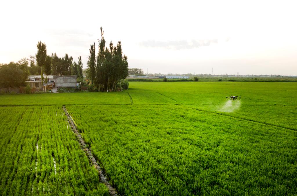 Photo taken on July 4, 2022 shows a drone carrying out agricultural work over a rice paddy field in Dujiazhuang Village, Sandaoba Township, Midong District, Urumqi, northwest China's Xinjiang Uygur Autonomous Region.