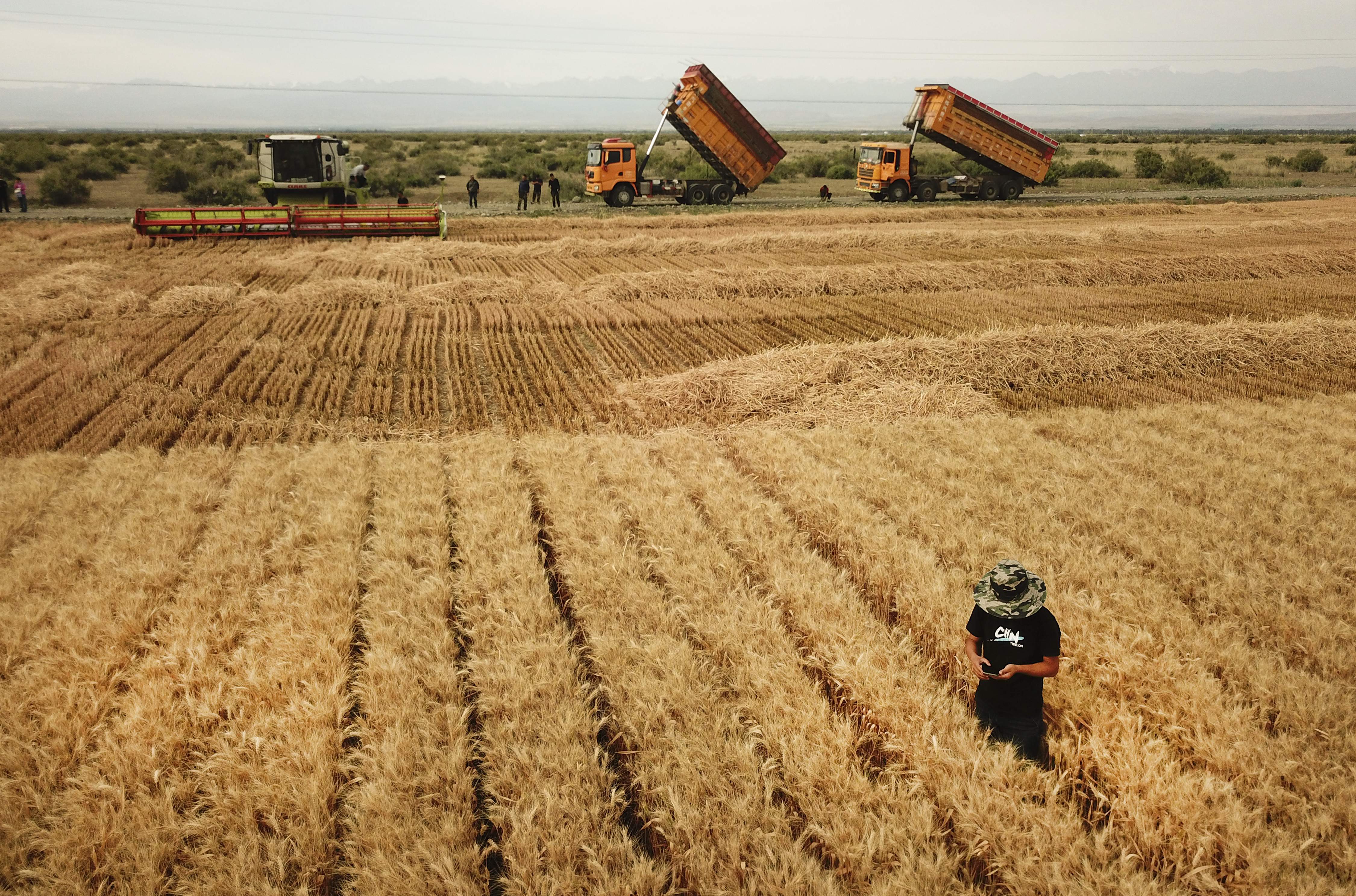 Aerial photo taken on July 7, 2022 shows a combine harvester reaping wheat in a field in Qitai County, Changji Hui Autonomous Prefecture, northwest China's Xinjiang Uygur Autonomous Region.