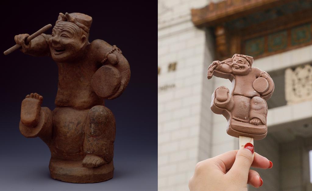 Combo photo shows the Pottery Storyteller beating a drum displayed at the National Museum of China (NMC) in Beijing, capital of China, and an ice cream bar in the shape of a similar ceramic figure (R). (The National Museum of China/Handout via Xinhua)