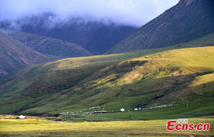 Livestock grazes in Bayanbulak grasslands in northwest China's Xinjiang Uyghur autonomous region in July, 2022. (Photo/China News Service)
