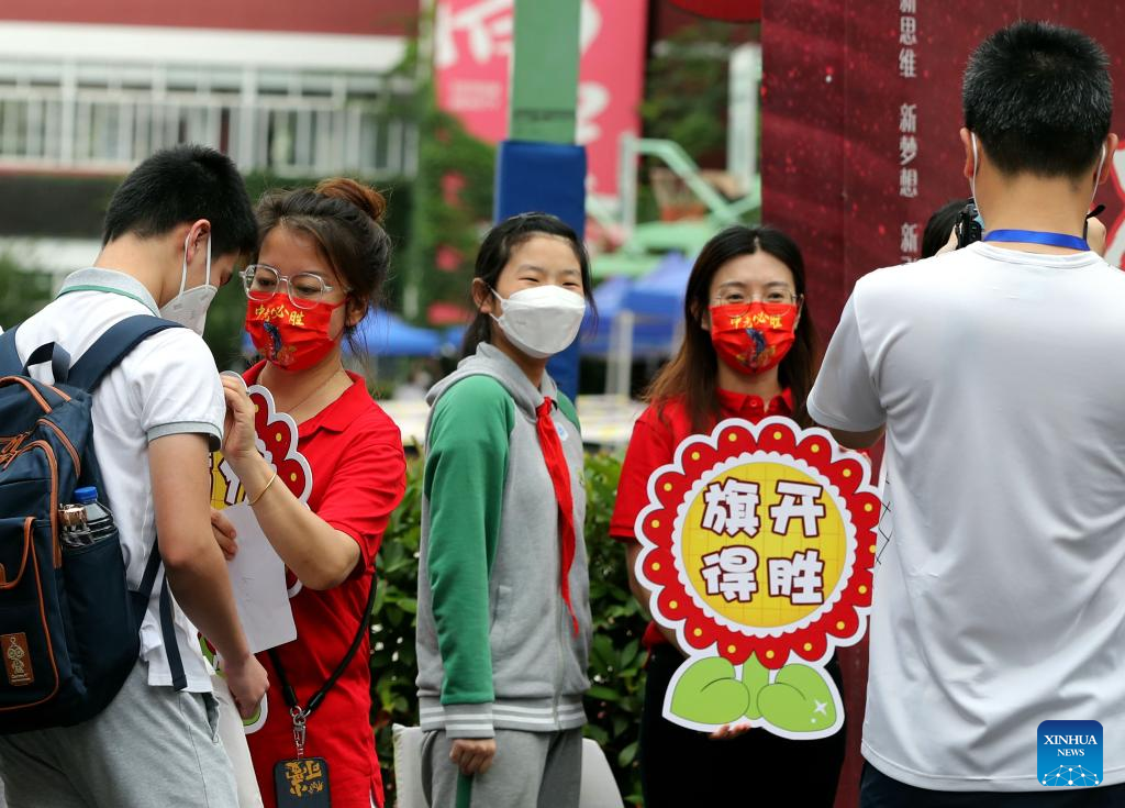 Students and their teachers holding boards with their best wishes pose for pictures at an exam site of the 2022 senior high school entrance examination in Minhang District of east China's Shanghai, July 11, 2022. The 2022 senior high school entrance examination in Shanghai kicked off on Monday. The city's entrance examinations for senior high schools have been postponed for about a month due to the resurgence of COVID-19 infections. (Xinhua/Liu Ying)