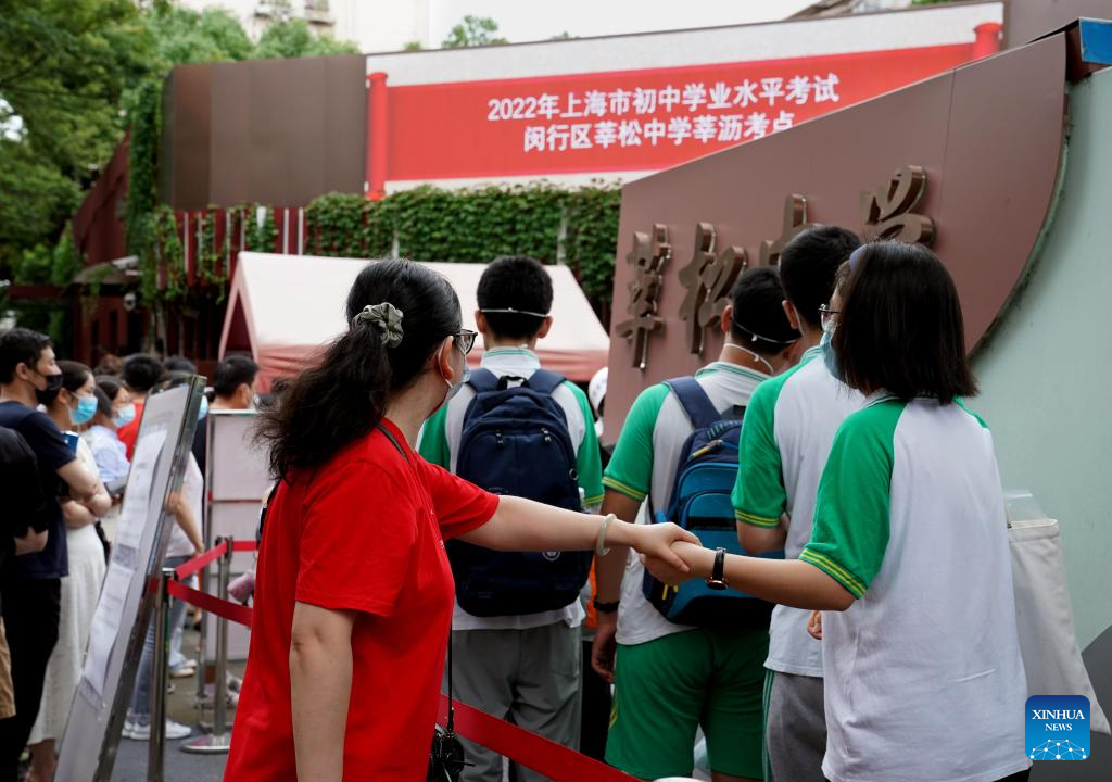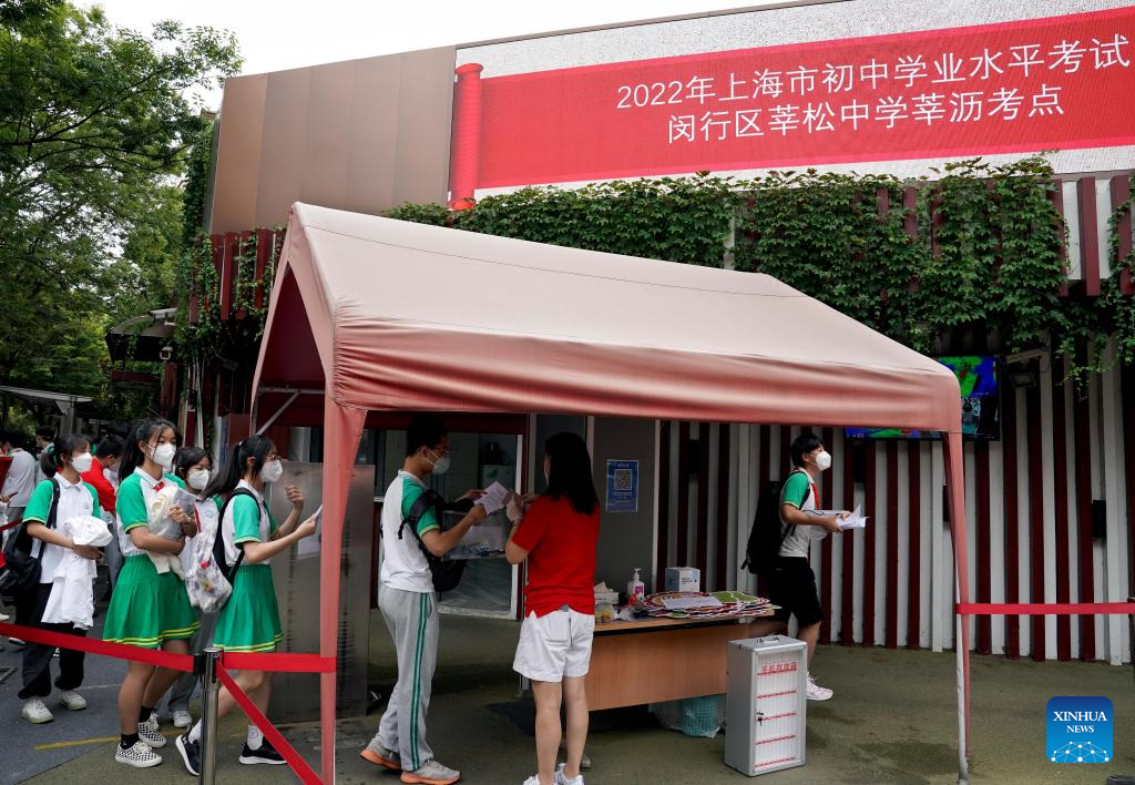 Students queue up to enter an exam site of the 2022 senior high school entrance examination in Minhang District of east China's Shanghai, July 11, 2022. The 2022 senior high school entrance examination in Shanghai kicked off on Monday. The city's entrance examinations for senior high schools have been postponed for about a month due to the resurgence of COVID-19 infections. (Xinhua/Liu Ying)