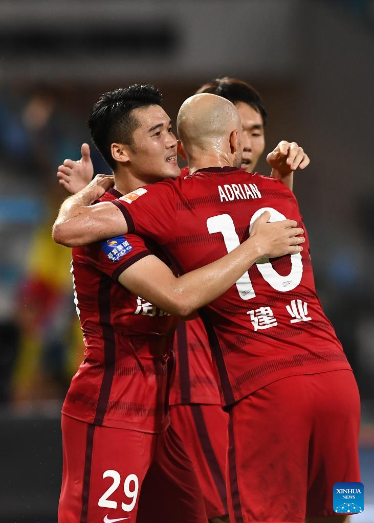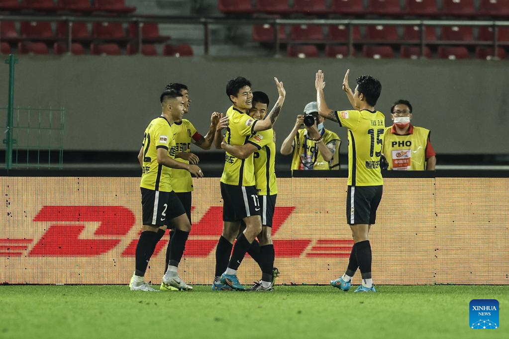 Players of Henan SSLM celebrate a goal during a 2022 season Chinese Football Association Super League (CSL) match between Changchun Yatai and Henan SSLM in Haikou, south China's Hainan Province, July 11, 2022. (Xinhua/Hu Zhixuan)