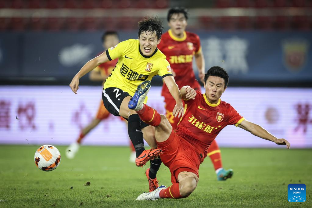 Yuan Mincheng (L) of Shenzhen FC vies with Wang Ziming of Beijing Guoan during their 2022 season Chinese Football Association Super League (CSL) match in Meizhou, south China's Guangdong Province, July 11, 2022. (Xinhua/Wang Guansen)
