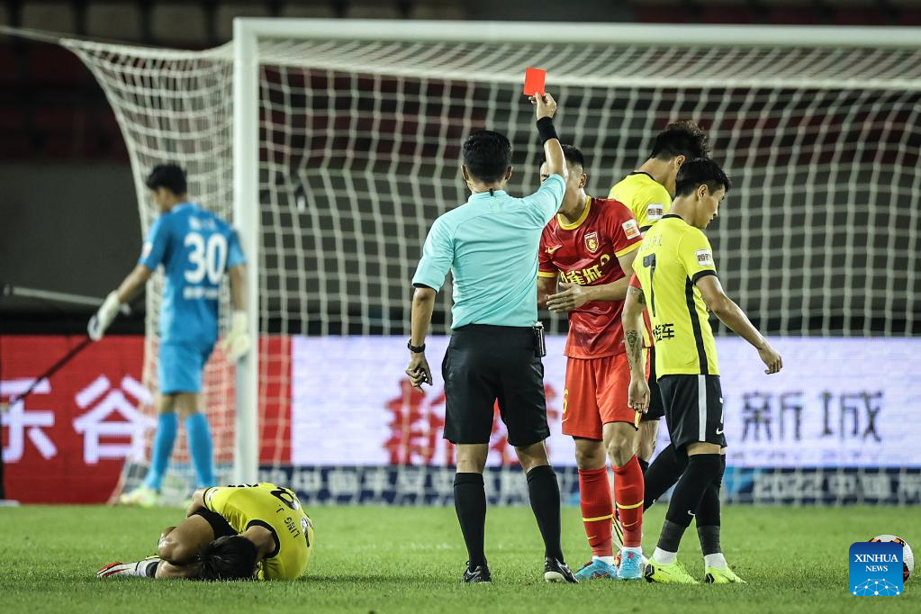 Zhang Junzhe (3rd R) of Hebei FC gets a red card during a 2022 season Chinese Football Association Super League (CSL) match between Hebei FC and Guangzhou in Dalian, northeast China's Liaoning Province, July 11, 2022. (Xinhua/Pan Yulong)
