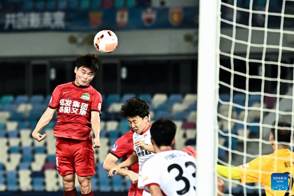 Huang Zichang (1st L) of Henan SSLM jumps for a header during a 2022 season Chinese Football Association Super League (CSL) match between Changchun Yatai and Henan SSLM in Haikou, south China's Hainan Province, July 11, 2022. (Xinhua/Hu Zhixuan)