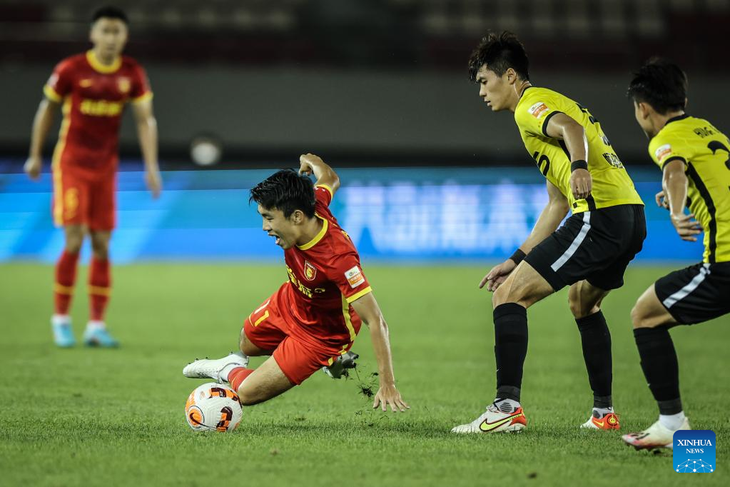 Wei Shihao (1st L) of Guangzhou passes the ball during a 2022 season Chinese Football Association Super League (CSL) match between Hebei FC and Guangzhou in Dalian, northeast China's Liaoning Province, July 11, 2022. (Xinhua/Pan Yulong)