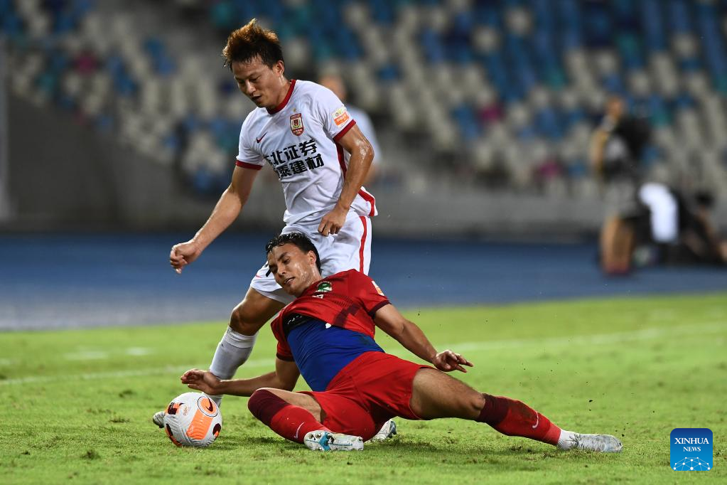 Dilmurat Mawlanyaz (bottom) of Henan SSLM vies with Rao Weihui of Changchun Yatai during their 2022 season Chinese Football Association Super League (CSL) match in Haikou, south China's Hainan Province, July 11, 2022. (Xinhua/Hu Zhixuan)