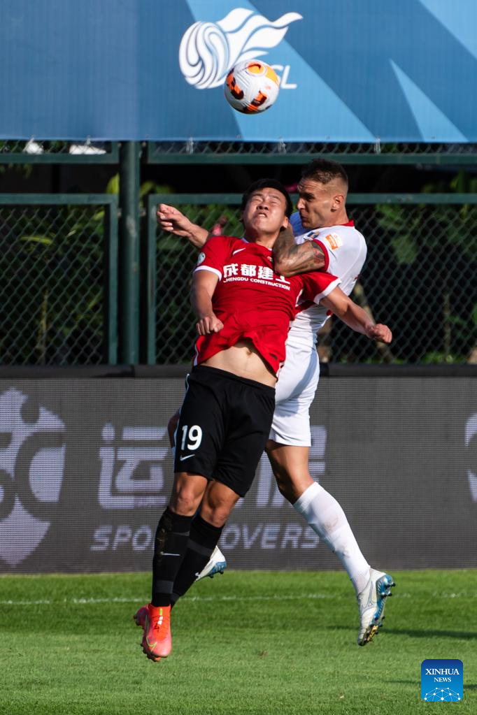 Xiang Baixu (L) of Chengdu Rongcheng jumps for a header during a 2022 season Chinese Football Association Super League (CSL) match between Chengdu Rongcheng and Meizhou Hakka in Meizhou, south China's Guangdong Province, July 11, 2022. (Xinhua/Wang Guansen)