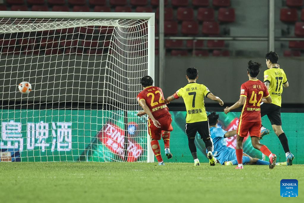 Yang Liyu (1st R) of Guangzhou scores a goal during a 2022 season Chinese Football Association Super League (CSL) match between Hebei FC and Guangzhou in Dalian, northeast China's Liaoning Province, July 11, 2022. (Xinhua/Pan Yulong)