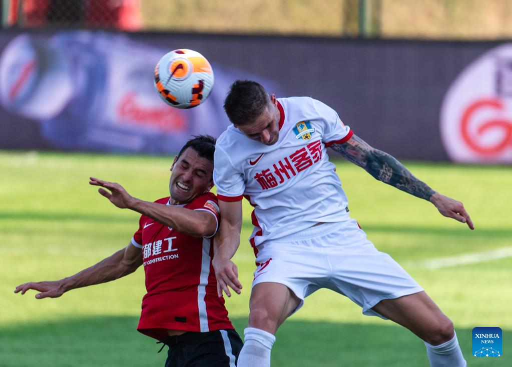 Aleksa Vukanovic (R) of Meizhou Hakka vies for a header during a 2022 season Chinese Football Association Super League (CSL) match between Chengdu Rongcheng and Meizhou Hakka in Meizhou, south China's Guangdong Province, July 11, 2022. (Xinhua/Wang Guansen)
