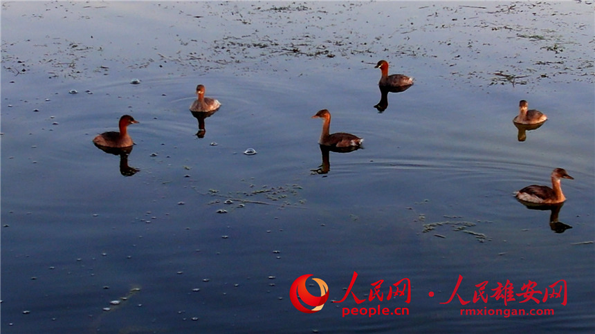 A little grebe and several fledglings take a rest on the waters of Baiyangdian Lake in the Xiong’an New Area, north China’s Hebei Province. (Photo/Gao Teng)
