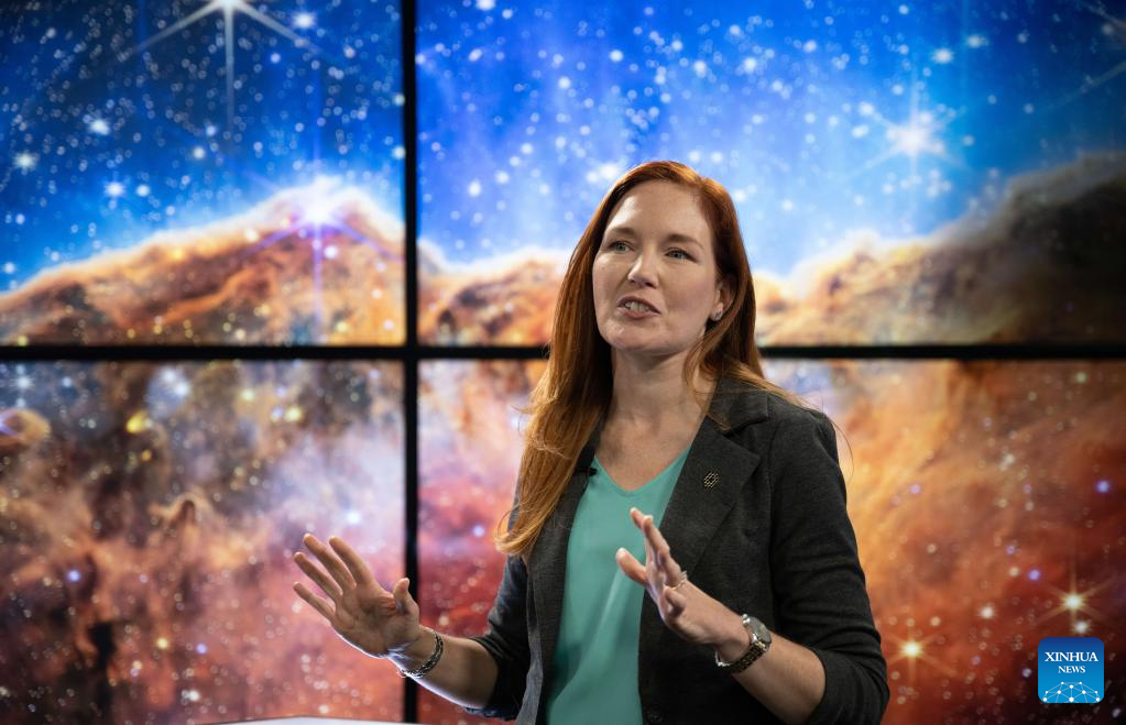 NASA James Webb Space Telescope Deputy Project Scientist for Communications Amber Straughn speaks about the infrared image of the star-forming region called NGC 3324 in the Carina Nebula as it is shown on a screen during a broadcast releasing the telescope's first full-color images at NASA's Goddard Space Flight Center in Greenbelt, Maryland, the Untied States, on July 12, 2022. NASA released James Webb Space Telescope's first full-color images of the universe and their spectroscopic data on Tuesday, revealing the unprecedented and detailed views of the universe. (NASA/Bill Ingalls/Handout via Xinhua)