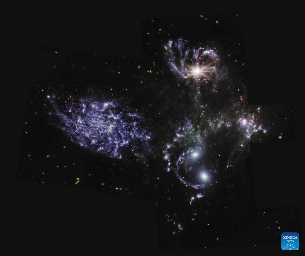 Image released by NASA on July 12, 2022 shows Stephan's Quintet, a group of five galaxies that appear close to each other in the sky: two in the middle, one toward the top, one to the upper left, and one toward the bottom. NASA released James Webb Space Telescope's first full-color images of the universe and their spectroscopic data on Tuesday, revealing the unprecedented and detailed views of the universe. (NASA, ESA, CSA, STScI/Handout via Xinhua)