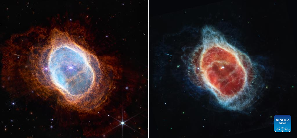 Image released by NASA on July 12, 2022 shows a side-by-side comparison of the Southern Ring Nebula in near-infrared light (L) and mid-infrared light (R) from NASA's James Webb Space Telescope. NASA released James Webb Space Telescope's first full-color images of the universe and their spectroscopic data on Tuesday, revealing the unprecedented and detailed views of the universe. (NASA, ESA, CSA, STScI/Handout via Xinhua)