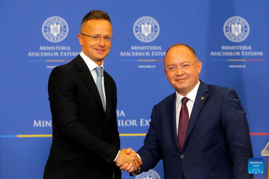 Romania's Foreign Minister Bodgan Aurescu (R) and visiting Hungarian Foreign Minister Peter Szijjarto attend a joint press conference in Bucharest, capital of Romania, July 12, 2022. The foreign affairs ministers of Romania and Hungary discussed here on Tuesday ways to increase the interconnection capacity of the two countries' gas distribution networks. (Photo by Cristian Cristel/Xinhua)