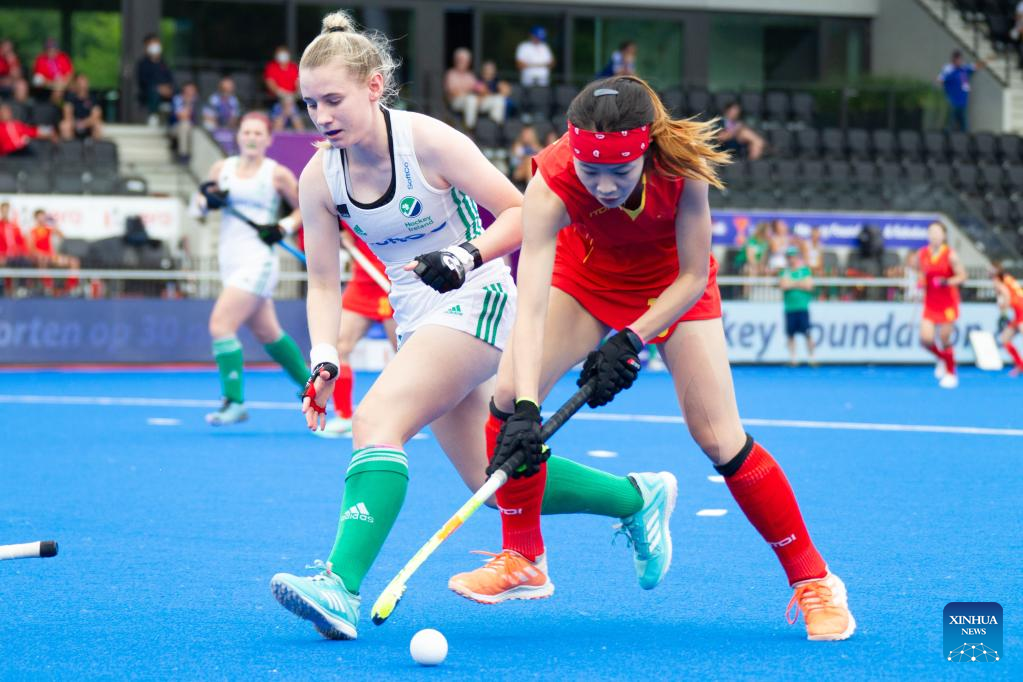 Chen Yanhua (R) of China vies with Christina Hamill of Ireland during the FIH Hockey Women's World Cup 2022 match between China and Ireland in Amsterdam, the Netherlands, July 12, 2022. (Photo by Sylvia Lederer/Xinhua)