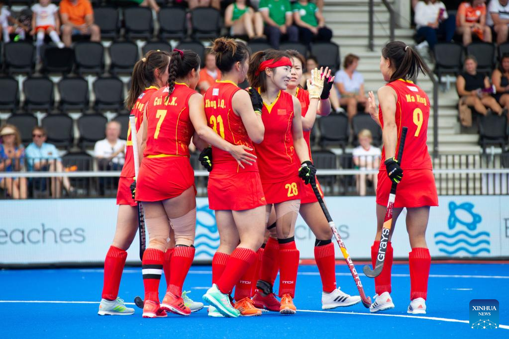 Players of China celebrate scoring during the FIH Hockey Women's World Cup 2022 match between China and Ireland in Amsterdam, the Netherlands, July 12, 2022. (Photo by Sylvia Lederer/Xinhua)