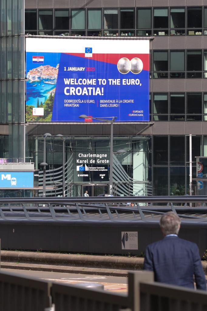 A vehicle runs past a poster writing "Welcome to the Euro, Croatia!" in Brussels, Belgium, July 12, 2022. Croatian Prime Minister Andrej Plenkovic on Tuesday welcomed the decision by the European Union's Economic and Financial Affairs Council (ECOFIN) to integrate Croatia into the eurozone on Jan. 1, 2023. (Xinhua/Zheng Huansong)