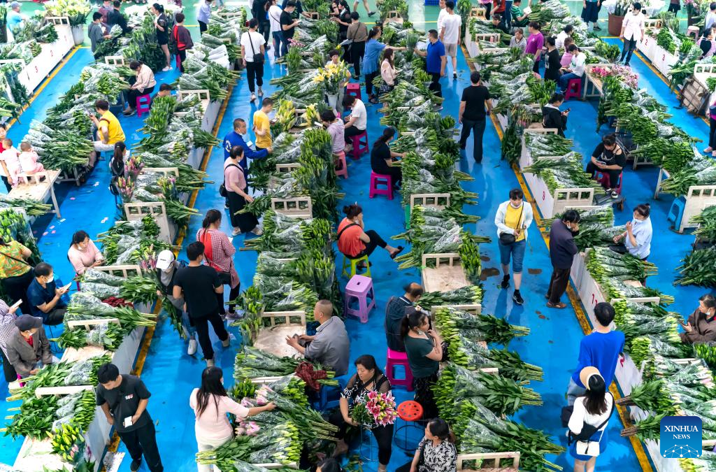 People visit the Kunming Dounan Flower Market at night in southwest China's Yunnan Province, July 12, 2022. Standing as China's largest fresh cut flower market in terms of both trade volume and export value for 23 consecutive years, Dounan has become the largest fresh cut flower trading market in Asia. In recent years, the market has vigorously developed the night economy with flower consumption, tourism and cultural experience. (Xinhua/Chen Xinbo)