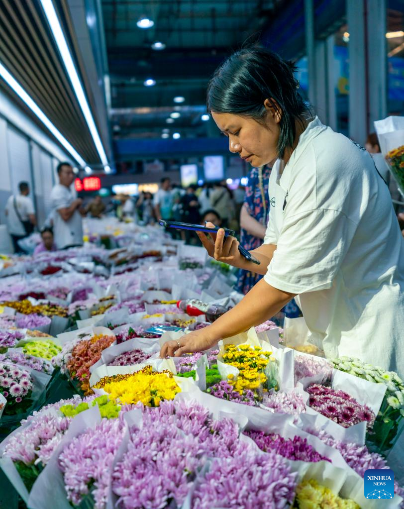 A shopkeeper sells flower via livestreaming at the Kunming Dounan Flower Market at night in southwest China's Yunnan Province, July 12, 2022. Standing as China's largest fresh cut flower market in terms of both trade volume and export value for 23 consecutive years, Dounan has become the largest fresh cut flower trading market in Asia. In recent years, the market has vigorously developed the night economy with flower consumption, tourism and cultural experience. (Xinhua/Chen Xinbo)