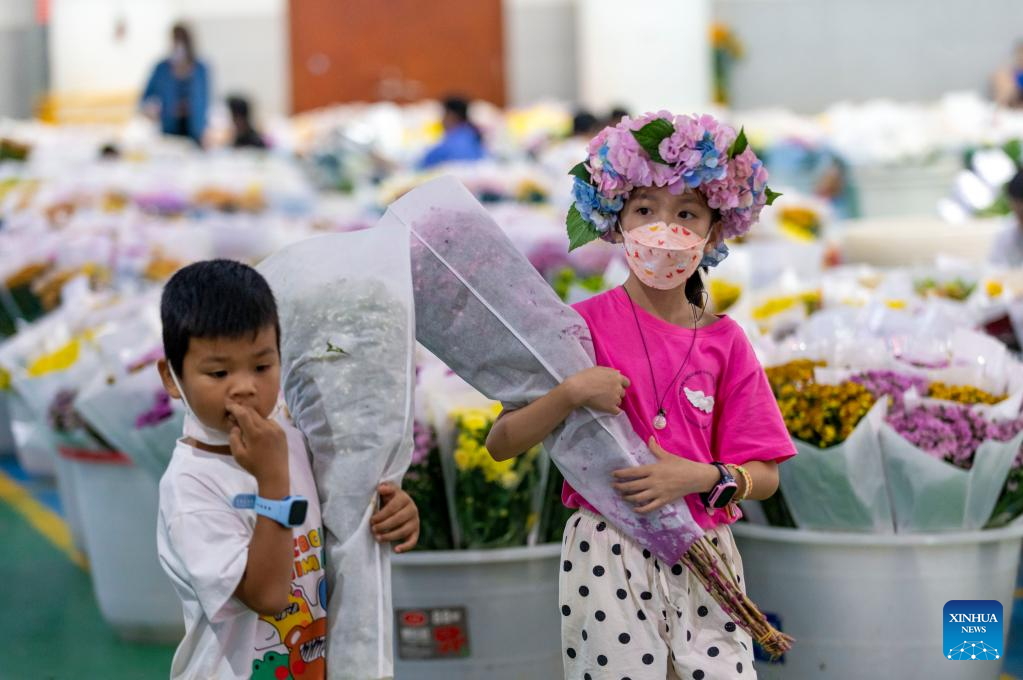 Children visit the Kunming Dounan Flower Market at night in southwest China's Yunnan Province, July 12, 2022. Standing as China's largest fresh cut flower market in terms of both trade volume and export value for 23 consecutive years, Dounan has become the largest fresh cut flower trading market in Asia. In recent years, the market has vigorously developed the night economy with flower consumption, tourism and cultural experience. (Xinhua/Chen Xinbo)