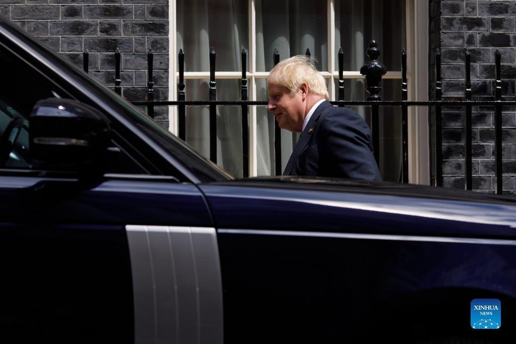 British Prime Minister Boris Johnson leaves 10 Downing Street for Prime Minister's Questions in London, Britain, July 13, 2022. Boris Johnson resigned as British prime minister and the leader of the Conservative Party in a statement to the country on July 7. The new prime minister of the United Kingdom (UK) replacing incumbent Boris Johnson will be announced on September 5, said Graham Brady, chairman of the Conservative Party's backbench 1922 Committee, on Monday. (Photo by Tim Ireland/Xinhua)