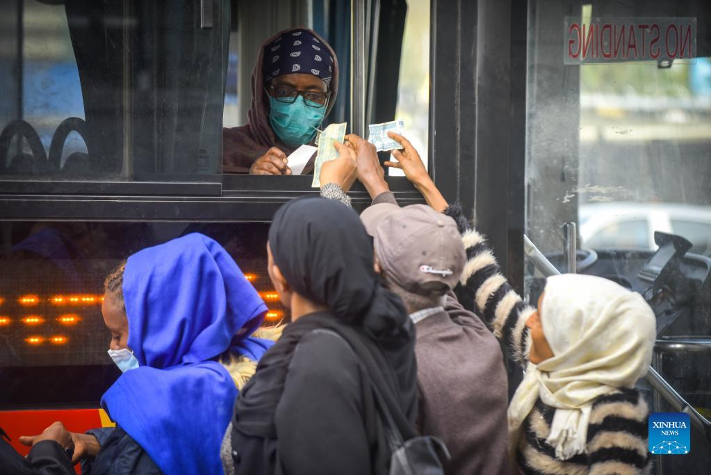 People gather to get on a bus in Addis Ababa, Ethiopia, on July 8, 2022. (Xinhua/Michael Tewelde)