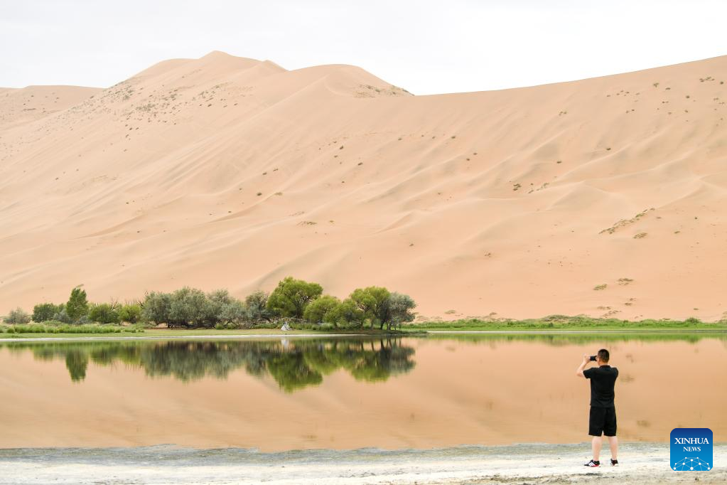 A tourist takes photos at the Badain Jaran Desert in north China's Inner Mongolia Autonomous Region, July 13, 2022. (Xinhua/Bei He)