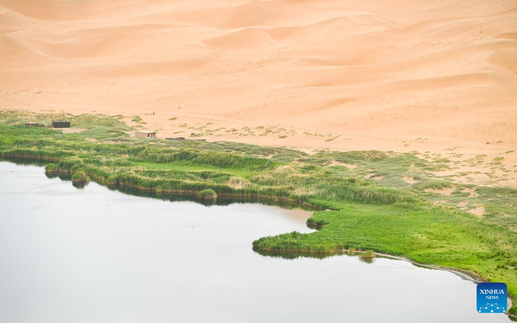 Aerial photo taken on July 13, 2022 shows a lake at the Badain Jaran Desert in north China's Inner Mongolia Autonomous Region. (Xinhua/Bei He)
