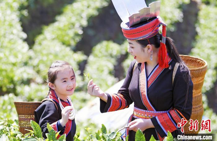 Wang Yungui picks tea leaves with her daughter at a tea garden in south China’s Guangxi Zhuang Autonomous Region. (Photo courtesy of the interviewee)