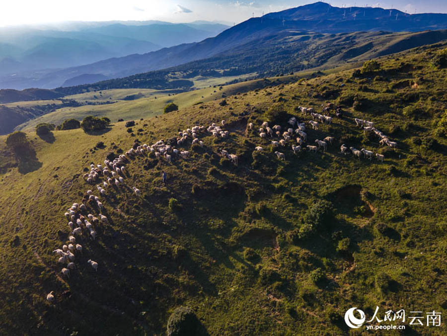 Photo shows a flock of sheep meandering along Niaodiaoshan Mountain in an early morning glow in the Dali Bai Autonomous Prefecture, southwest China’s Yunnan Province. (Photo/Luo Xincai)