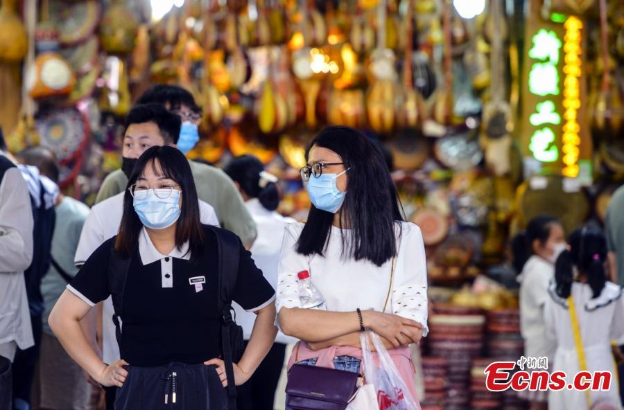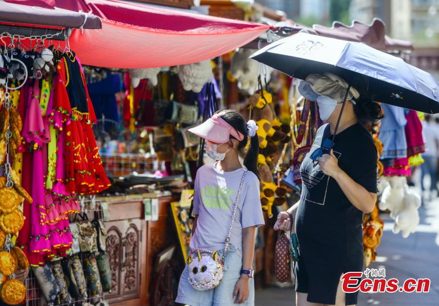 Tourists wander through the International Bazaar in Urumqi, capital of Northwest China's Xinjiang Uyghur Autonomous Region, July 14, 2022. (Photo: China News Service/Liu Xin)