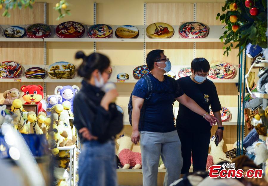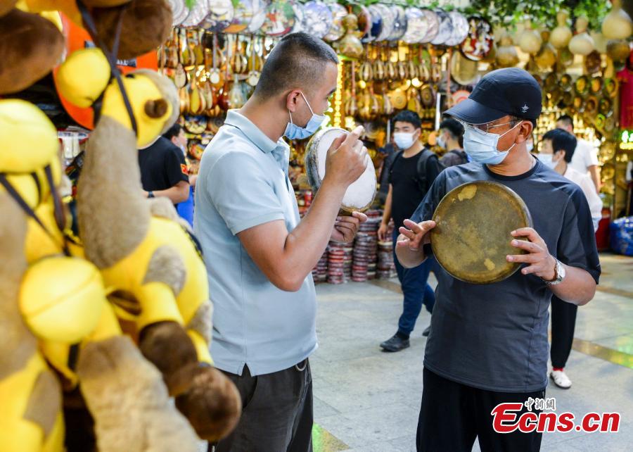 Tourists select local handicraft at the International Bazaar in Urumqi, capital of Northwest China's Xinjiang Uyghur Autonomous Region, July 14, 2022. (Photo: China News Service/Liu Xin)