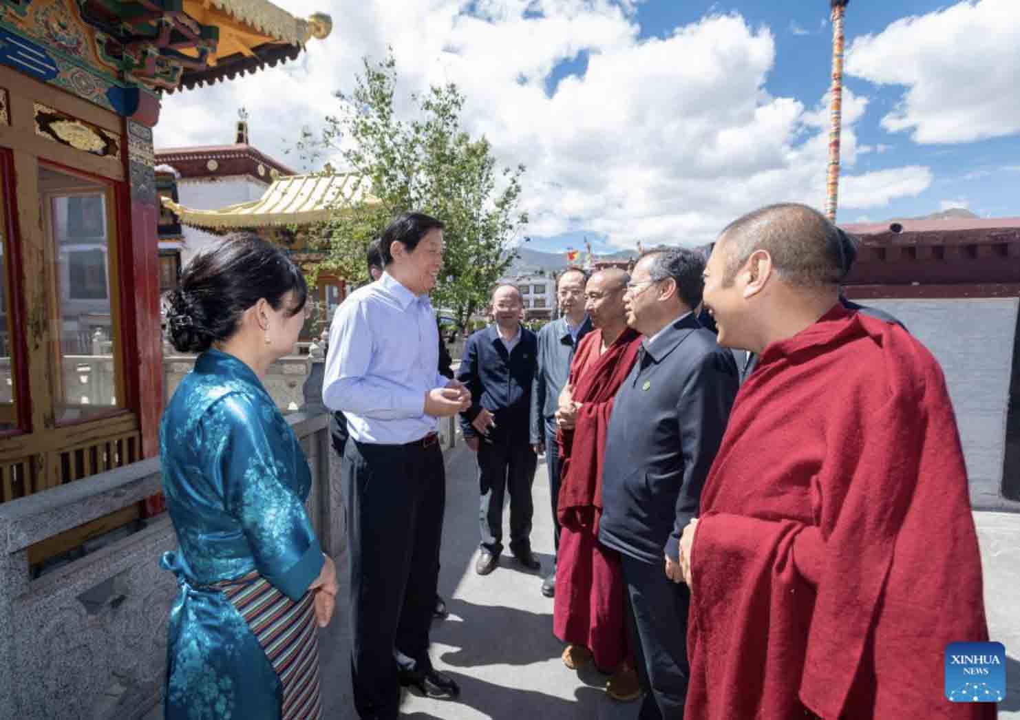 Li Zhanshu, a member of the Standing Committee of the Political Bureau of the Communist Party of China Central Committee and chairman of the National People's Congress Standing Committee, visits Jokhang Temple in Lhasa, southwest China's Tibet Autonomous region, July 14, 2022. Li made a research tour in southwest China's Tibet Autonomous Region related to the legislation on the ecological protection of the Qinghai-Tibet Plateau from Tuesday to Friday. (Xinhua/Zhai Jianlan)