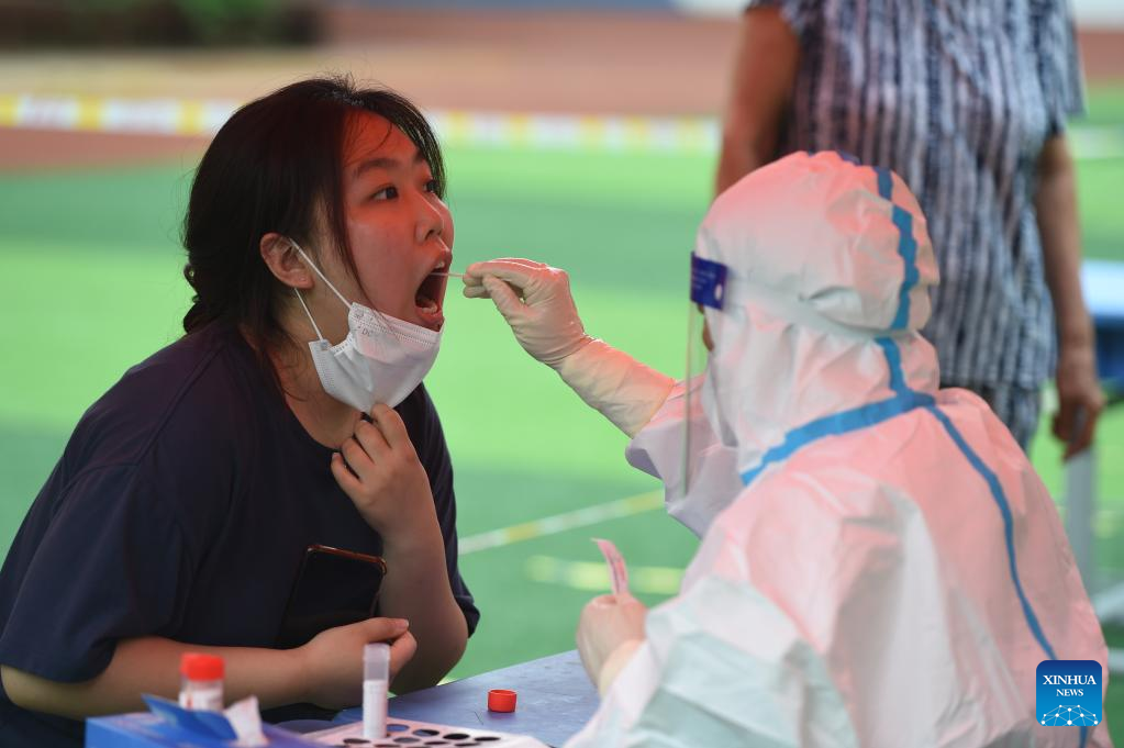 A medical worker takes a swab sample from a citizen for nucleic acid testing in Longzihu District of Bengbu City, east China's Anhui Province, July 17, 2022.