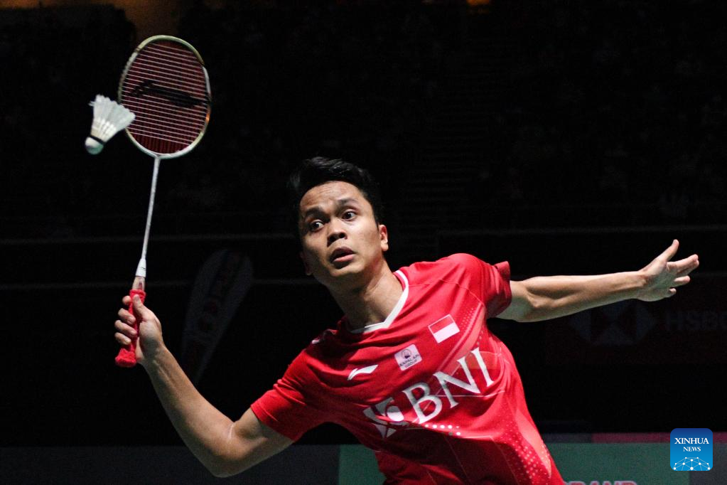 Anthony Sinisuka Ginting of Indonesia hits a return during men's singles final against Naraoka Kodai of Japan at Singapore Open 2022 badminton tournament in Singapore, July 17, 2022. (Photo by Then Chih Wey/Xinhua)
