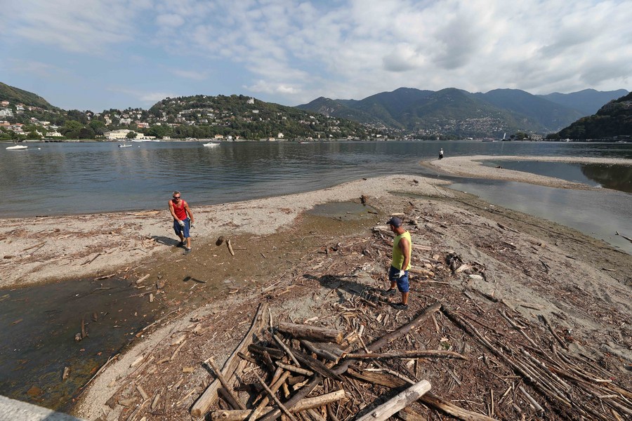 Photo taken on July 13, 2022 shows a low level of Lake Como in Como, Lombardy region, Italy. Italians were bracing for yet another heat wave and dry spell, with meteorologists predicting record-high temperatures and experts warning of a crisis in the country's agricultural sector. (Str/Xinhua)