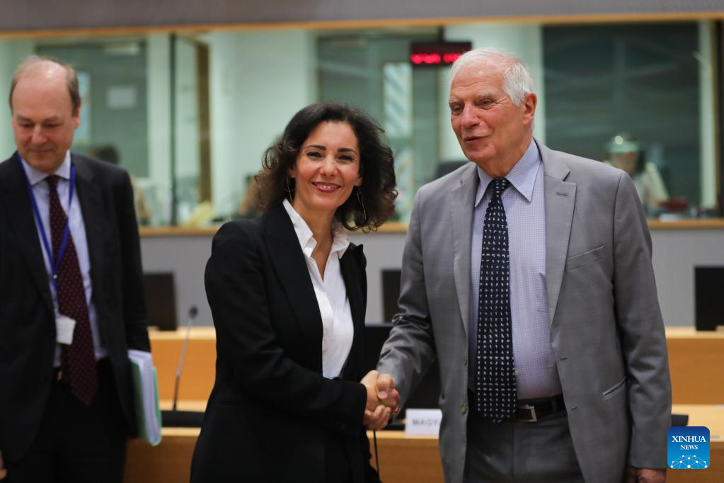 Belgium's Minister of Foreign Affairs Hadja Lahbib (C) attends the meeting of the EU Foreign Affairs Council in Brussels, Belgium, July 18, 2022. (Xinhua/Zheng Huansong)