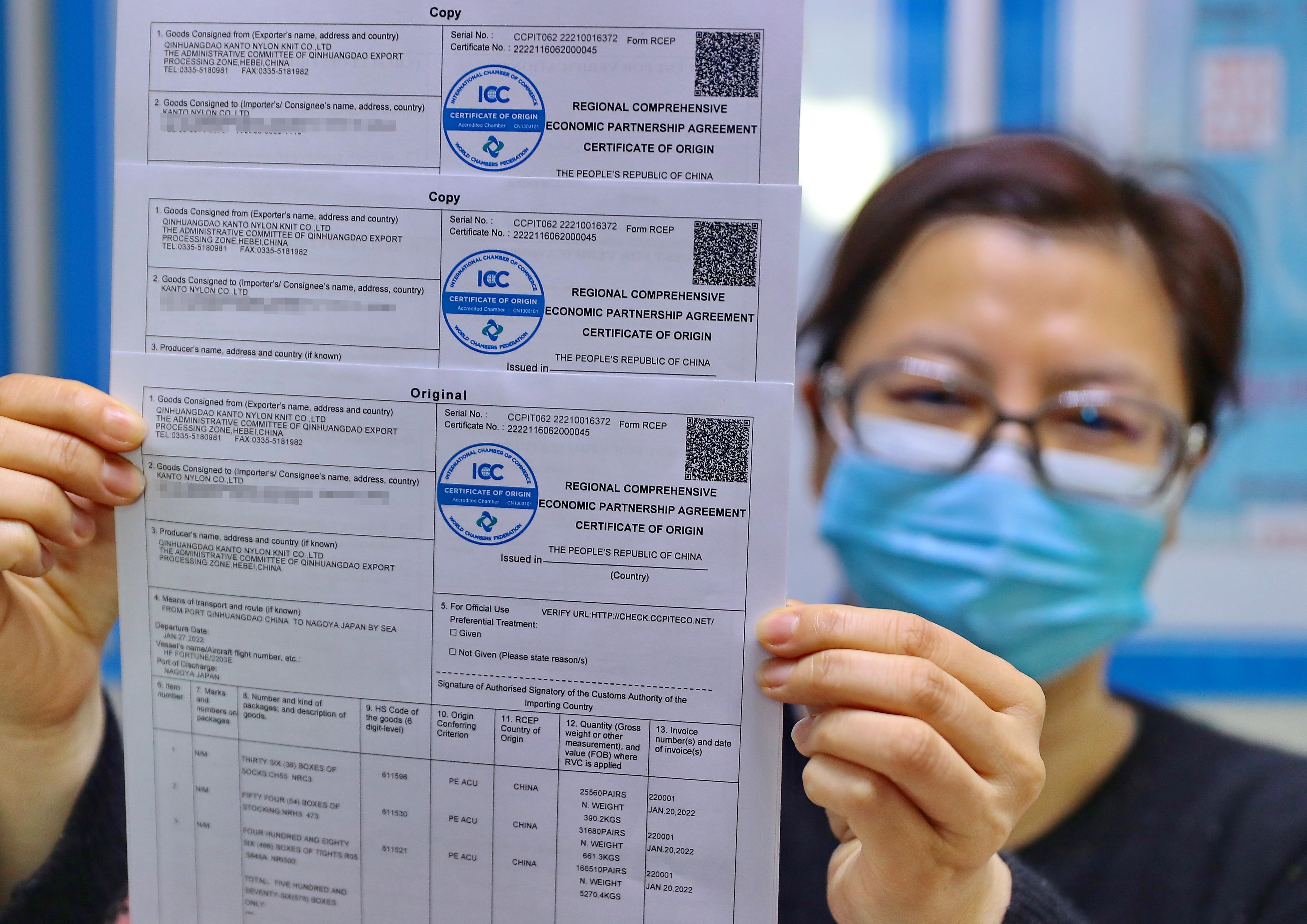 A staff member with the trade promotion council of Qinhuangdao, north China's Hebei province, shows the first Certificate of Origin under the Regional Comprehensive Economic Partnership issued by the council, Jan. 28, 2022. (People's Daily Online/Cao Jianxiong)