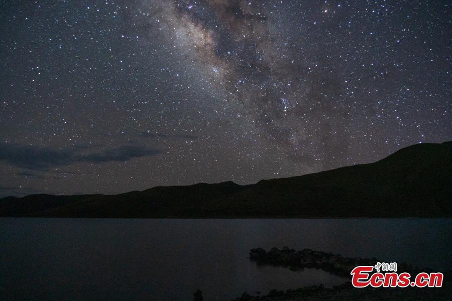 Stars sparkle in the sky over Yamdrok Lake in Nagarze County of Shannan Prefecture, Southwest China's Tibet Autonomous Region. The Yamdrok Lake is 4,441 meters above sea level and one of the three holy lakes in Tibet region. (Photo: China News Service/Jiang Feibo)