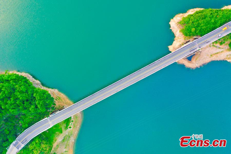 Aerial view shows picturesque scenery of Jintao bridge across the Meishan Reservoir in Jinzhai County of Lu'an city, east China's Anhui Province, July 8, 2022. (Photo: China News Service/Zhang Wentu)