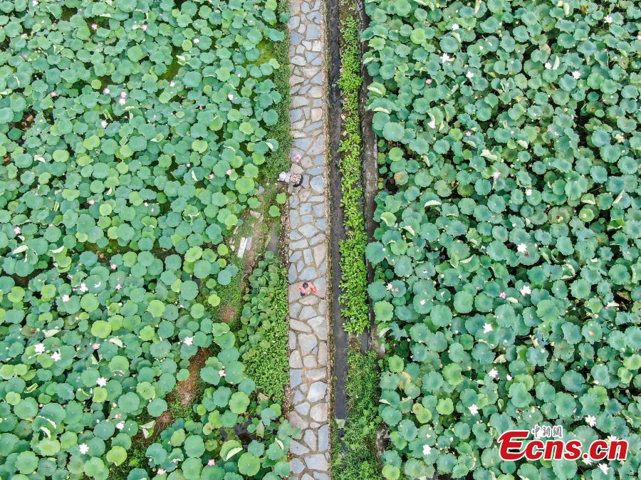 Tourists walk through lotus fields during the lotus flowers tourism festival at Yaoxi village, Guangchang county in east China's Jiangxi Province, July 19, 2022. (Photo: China News Service/Liu Lixin)