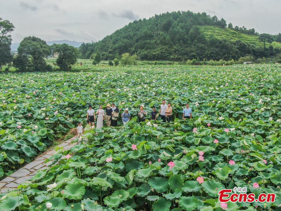 Tourists walk through lotus fields during the lotus flowers tourism festival at Yaoxi village, Guangchang county in east China's Jiangxi Province, July 19, 2022. (Photo: China News Service/Liu Lixin)