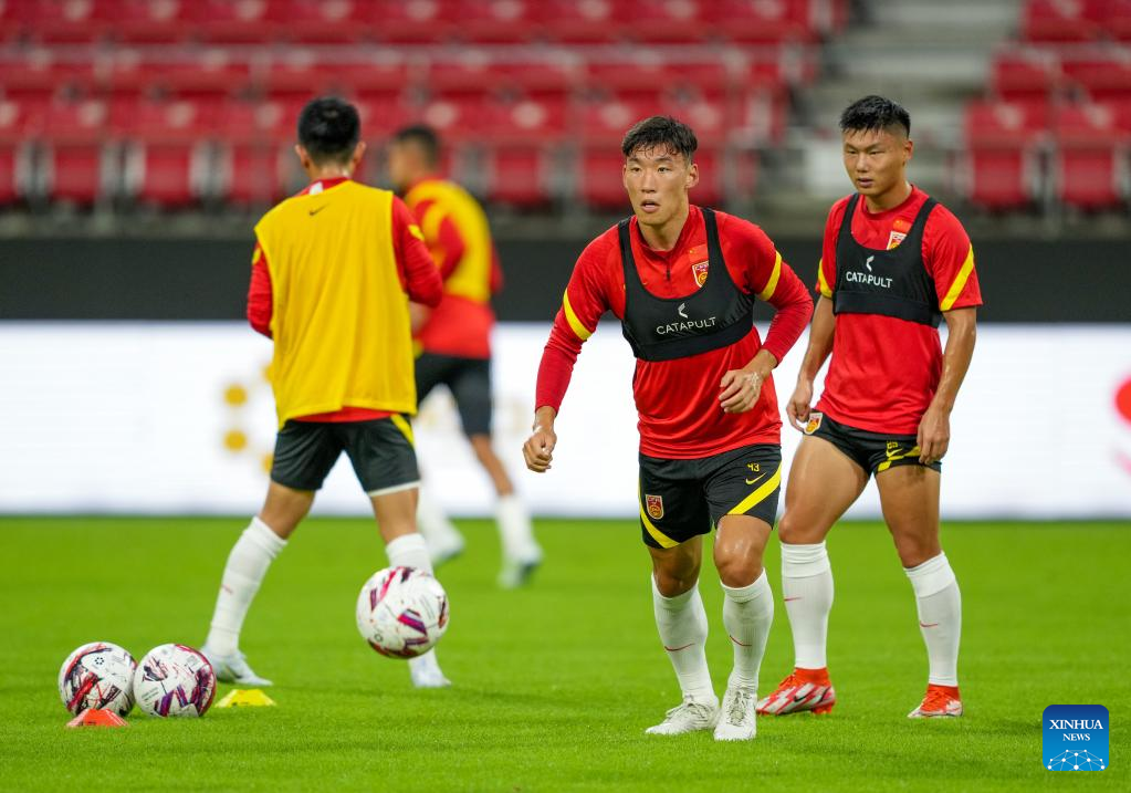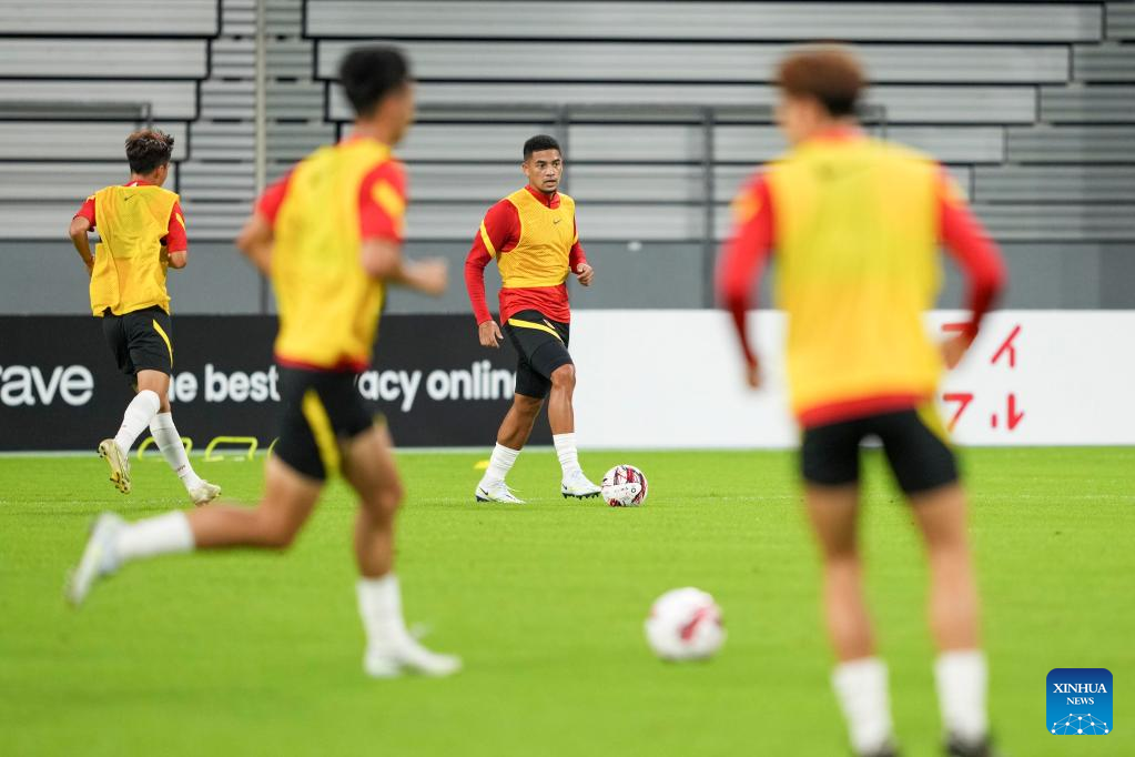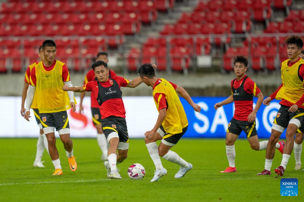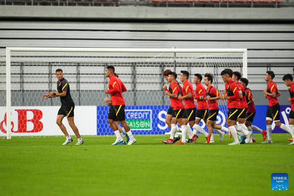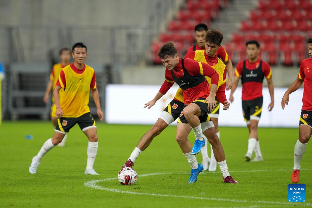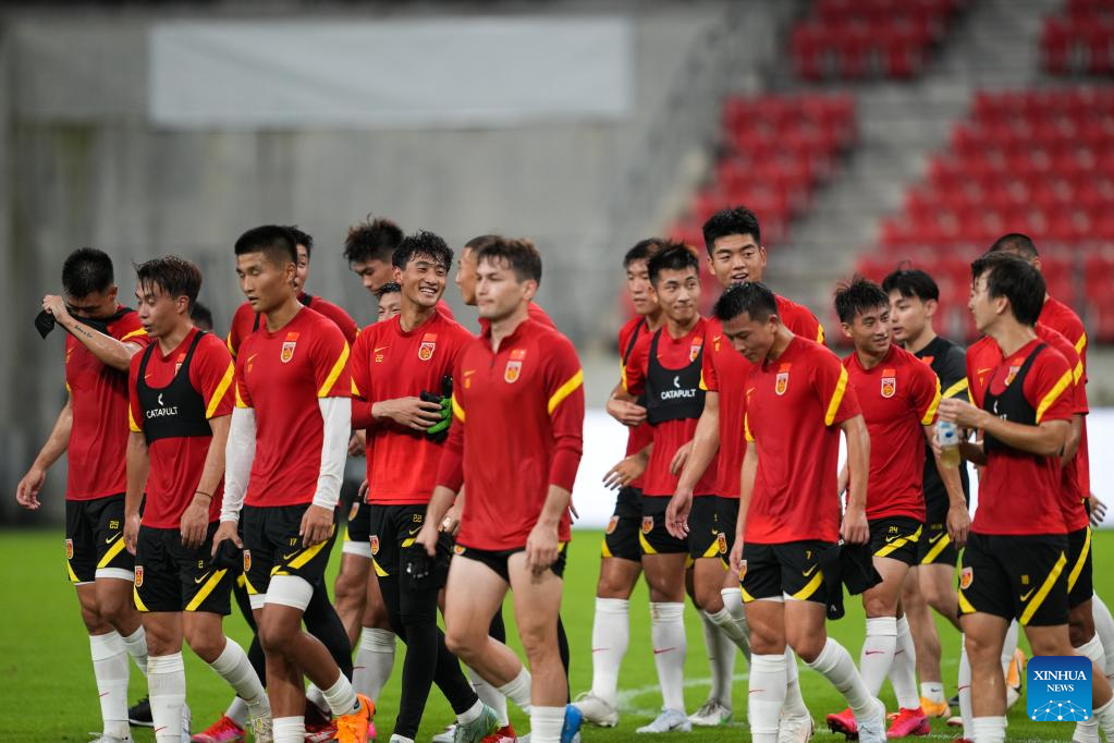 Players of China attend a training session prior to the 2022 EAFF (East Asian Football Federation) E-1 Football Championship match against South Korea at Toyota Stadium in Toyota City in Aichi prefecture, Japan, July 19, 2022. (Xinhua/Zhang Xiaoyu)