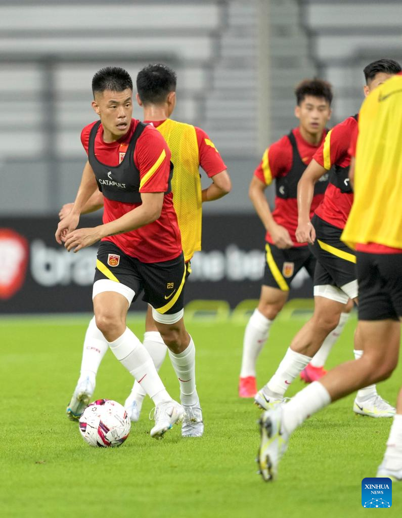 Zhu Chenjie (2nd R) of China attends a training session prior to the 2022 EAFF (East Asian Football Federation) E-1 Football Championship match against South Korea at Toyota Stadium in Toyota City in Aichi prefecture, Japan, July 19, 2022. (Xinhua/Zhang Xiaoyu)