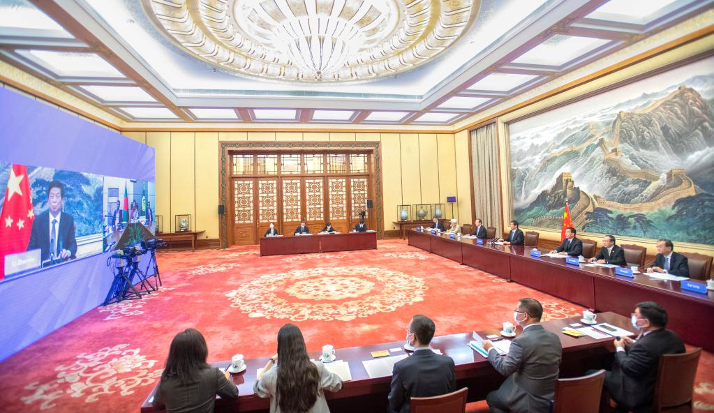 Li Zhanshu, chairman of the National People's Congress (NPC) Standing Committee, holds talks with Bangladeshi parliament speaker Shirin Sharmin Chaudhury via video link at the Great Hall of the People in Beijing, capital of China, July 19, 2022. (Xinhua/Li Tao)
