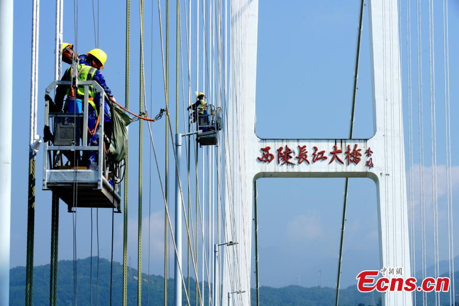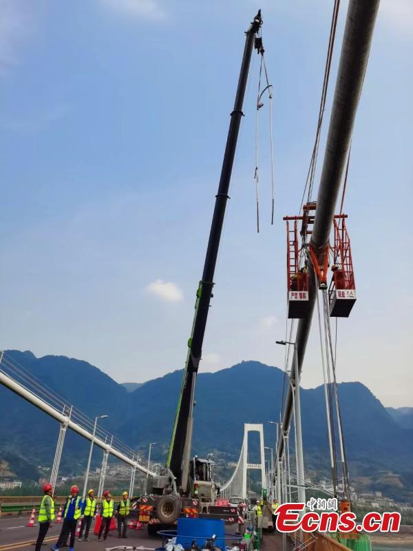 Replacement work of 280 cables on Xiling Yangtze River bridge is underway in Yichang, central China's Hubei Province, July 19, 2022. (Photo: China News Service/Tang Wei)