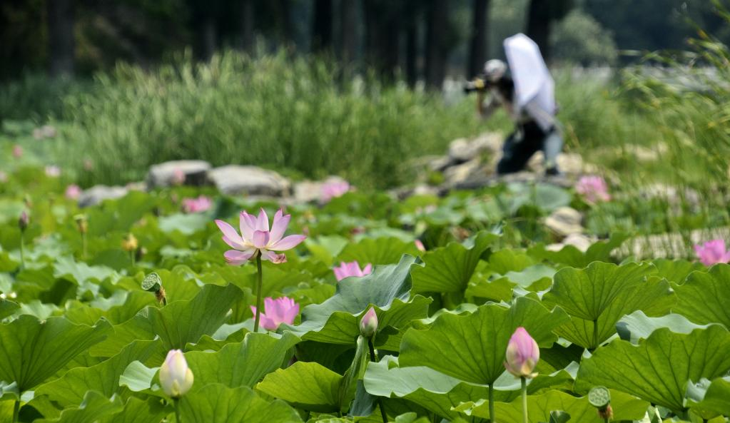 People enjoy lotus flowers at Yuanmingyuan Park in Beijing, capital of China, July 20, 2022. (Xinhua/Li Xin)