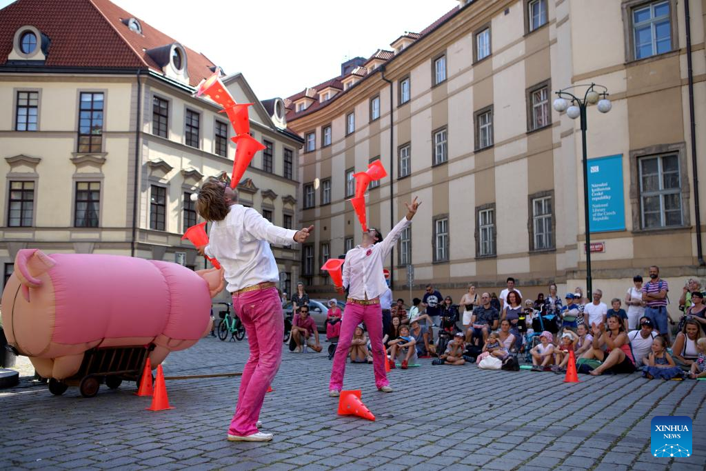 Two artists perform during the 14th Prague Street Theater Festival in Prague, the Czech Republic, July 19, 2022. The week-long festival, which saw more than 40 performances by artists from several countries, closed Tuesday in the Czech capital. (Photo by Dana Kesnerova/Xinhua)
